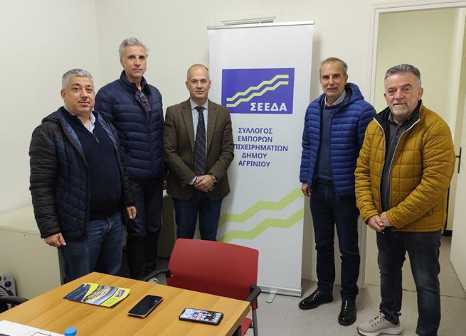 Ο Σύλλογος Εμπόρων και Επιχειρηματιών Δήμου Αγρινίου (ΣΕΕΔΑ), στο πλαίσιο των συναντήσεων με θεσμικούς φορείς, πραγματοποίησε συνάντηση με τον Αντιπεριφερειάρχη Οικονομικής Πολιτικής Νίκο Κατσακιώρη. Στη συνάντηση, που έγινε σε πολύ καλό κλίμα στα γραφεία του ΣΕΕΔΑ, ο Πρόεδρος και τα μέλη του ΔΣ ενημέρωσαν τον Αντιπεριφερειάρχη για την εξέλιξη της τοπικής αγοράς τον τελευταίο χρόνο και τα προβλήματα που αντιμετωπίζουν οι έμποροι και οι επιχειρήσεις τους.